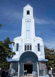 Implantada junto à via pública, apresenta fachada simétrica, acesso central marcado e elemento vertical que reforça sua presença urbana. A volumetria é compacta, organizada a partir de nave única e altar centralizado.